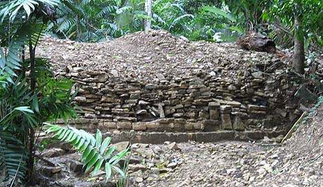 Palacio de los Estucos en Cancuén. La mayoría de estructuras están enterradas y en trabajos de restauración. El Palacio de Estuco, junto a la plaza y campo de juego de pelota eran al momento de la visita de los más trabajados. Esta edificación poseía acabados y relieves en estuco con figuras humanas que se cree representaban a los integrantes de la dinastía que gobernó Cancuén. Los muros interiores se decoraron con murales vistosos.