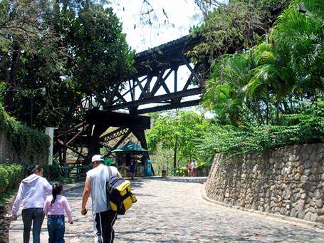 Puente curvo de Agua Caliente. Cuenta con un mini zoológico con aves regionales incluyendo de rapiña. Posee también tucanes, pizotes, mapaches y monos.