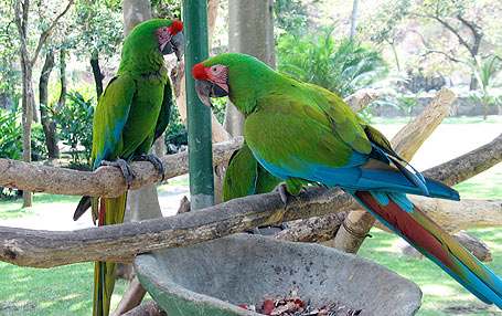 Sorprende que las guacamayas y loros vivan permanentemente en libertad. No se les cortan las alas y sin embargo, libres de irse cuando quieran deciden quedarse... viven tranquilas fuera de jaulas comiendo tranquilamente mientras los visitantes disfrutan de sus colores.